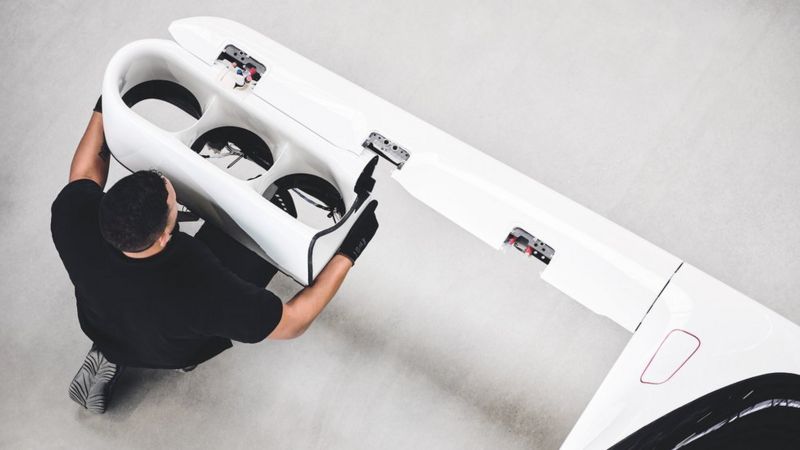 Jego charakterystyczna maszyna eVTOL posiada 36 silników elektrycznych umieszczonych wewnątrz smukłych, białych skrzydeł i samolotów z ogonem. Są to wentylatory kanałowe, zasysające powietrze i wydmuchujące je w sposób silnika odrzutowego, ale bez mieszania go z paliwem. Ta masa wentylatorów wytwarza silny prąd, który popycha mały pięciomiejscowy strumień do 300km/h (186mph) i daje pilotowi kontrolę nad kierunkiem.